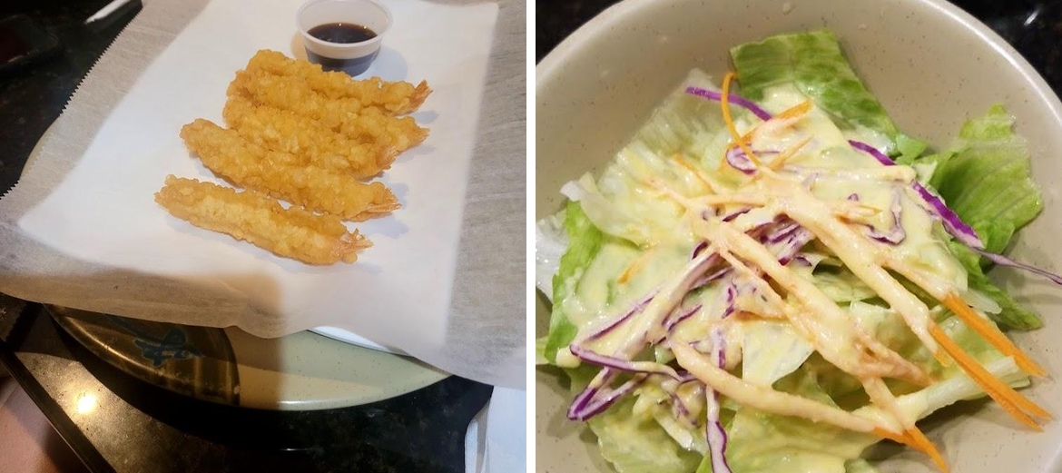 Tempura shrimp, cucumber. Topped with crabstick, crunch, eel sauce and wasabi sauce.